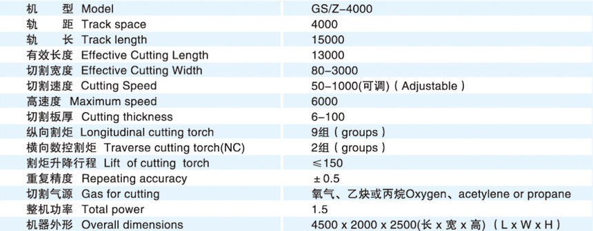 GS/Z-4000系列數控/直條火焰切割機它是由多頭直條機和數控機構合二為一的機型。它是數控控制、精密機械傳動和燃氣切割結合的體現。是一種高精度、高可靠性的熱切割設備。其配置的機械裝置和燃氣聯合動作,由電腦控制。可按照圖紙要求以編程方式切割出各種形狀復雜的零件。