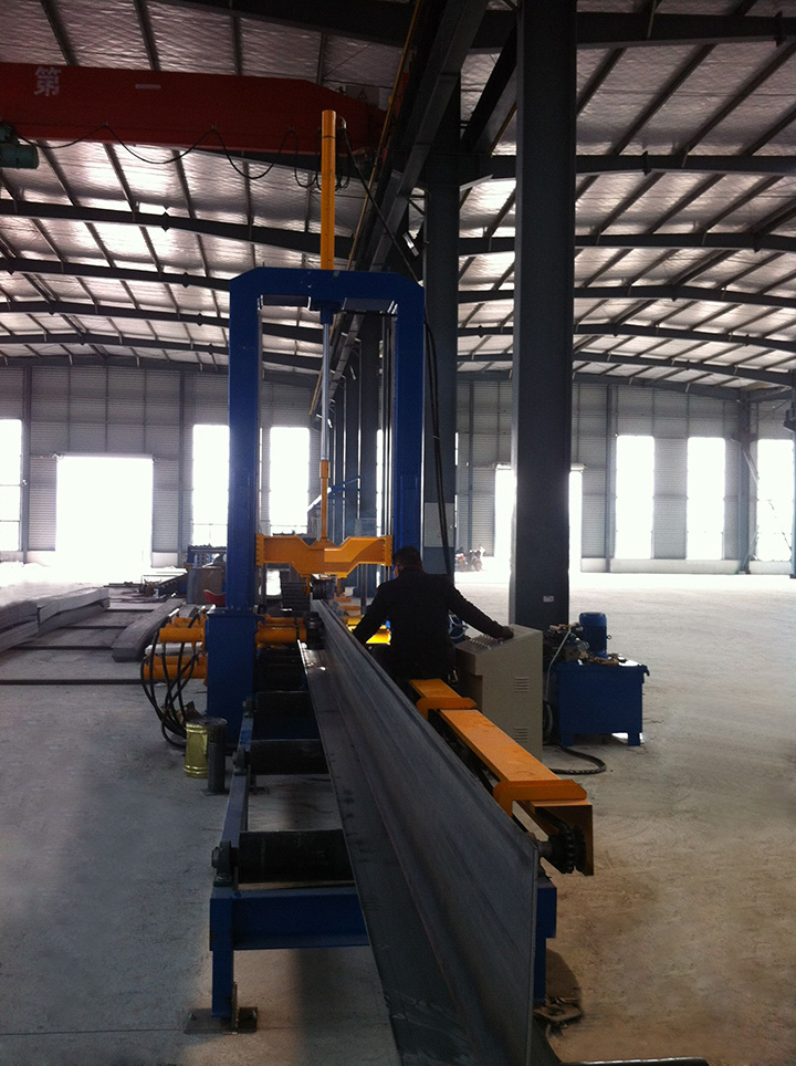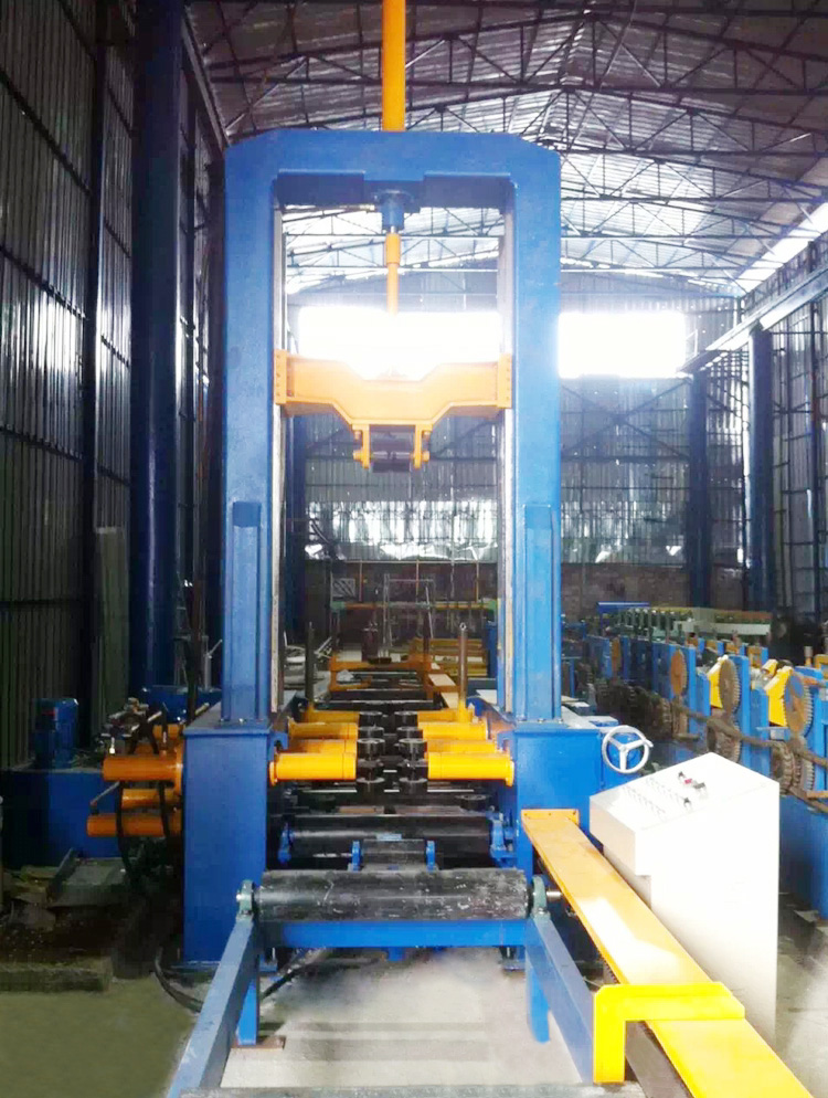 HG-1800H型鋼自動液壓組立機(jī)采用通用的一側(cè)機(jī)械緊靠對齊,而另一側(cè)采用液壓缸夾緊的方式,主機(jī)并用三組腹板夾緊,避免開平板及薄板組立時的中心偏移。采進(jìn)行組立以及點焊的。主門架采用雙導(dǎo)軌壓料,平衡性能好。